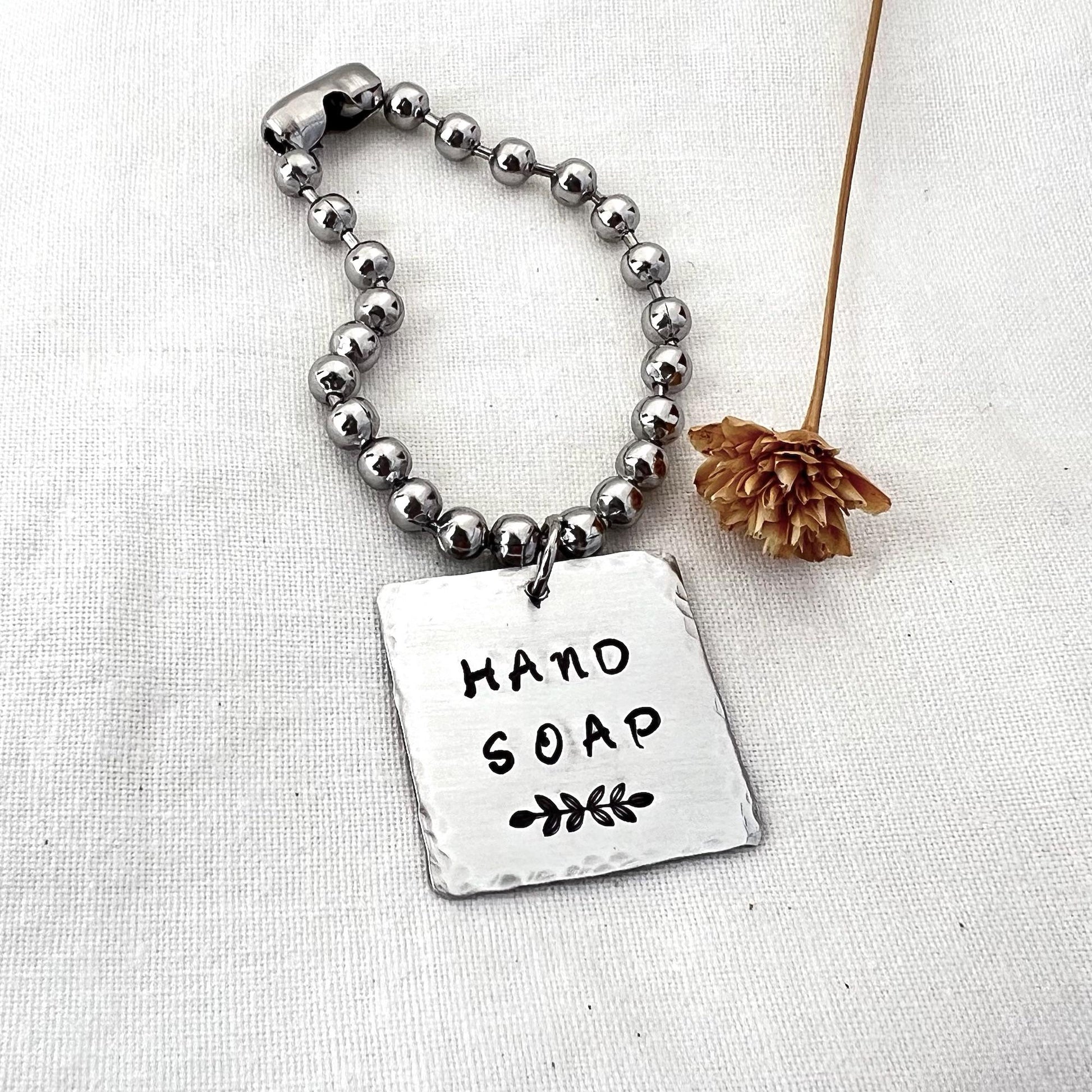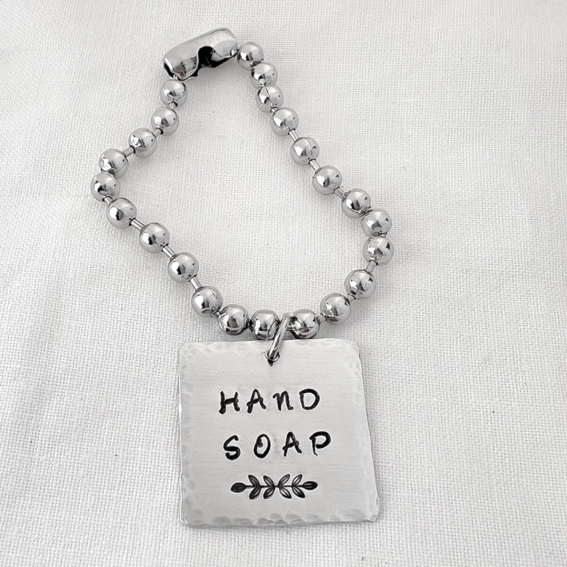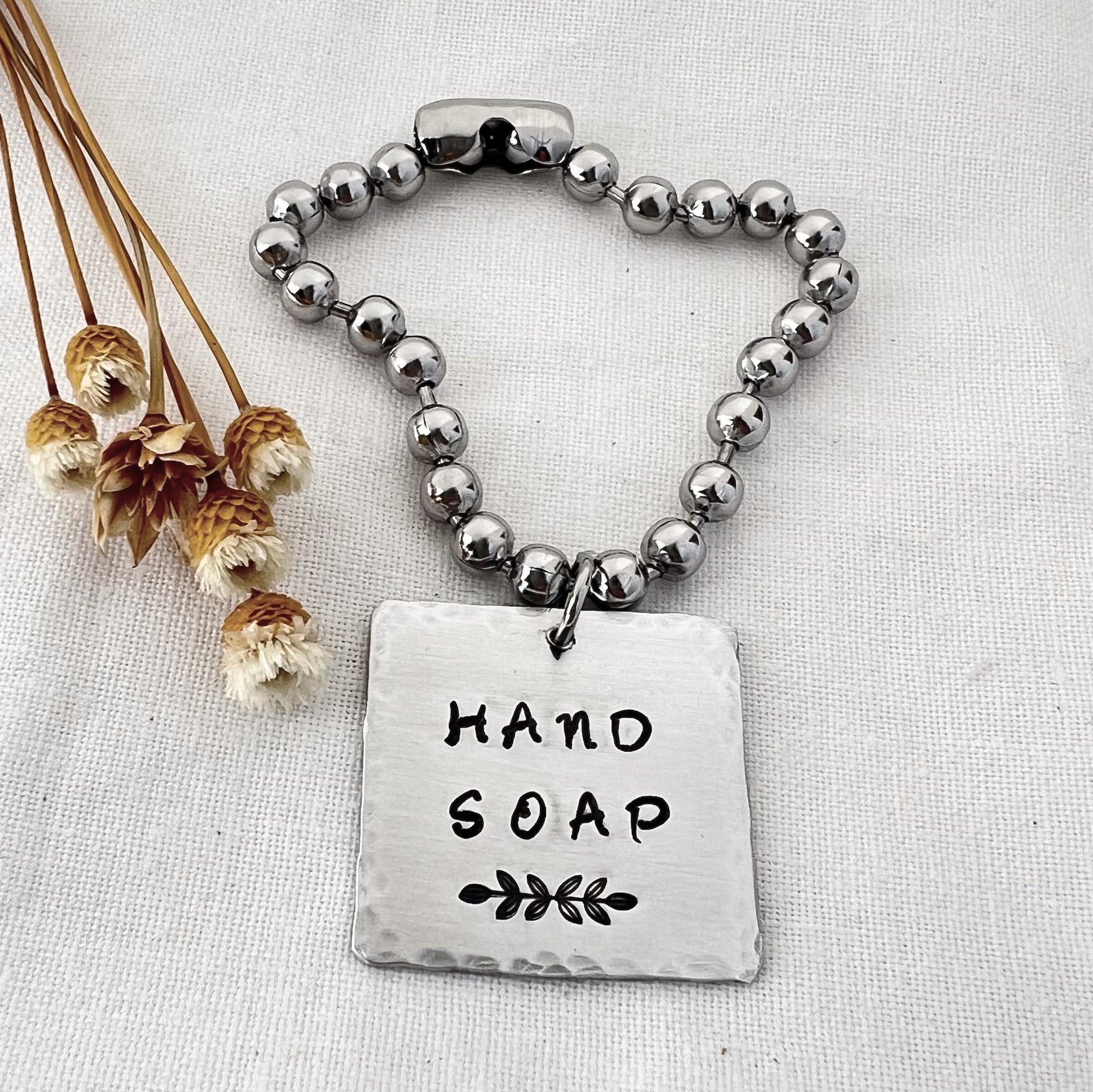 Label your hand soap or lotion or choose to create your own label. The tags are made of high quality aluminum and given a slightly brushed finish then hand stamped with your personalization and leaf design. Comes with a stainless steel chunky4.5mm chain ready to hang.
