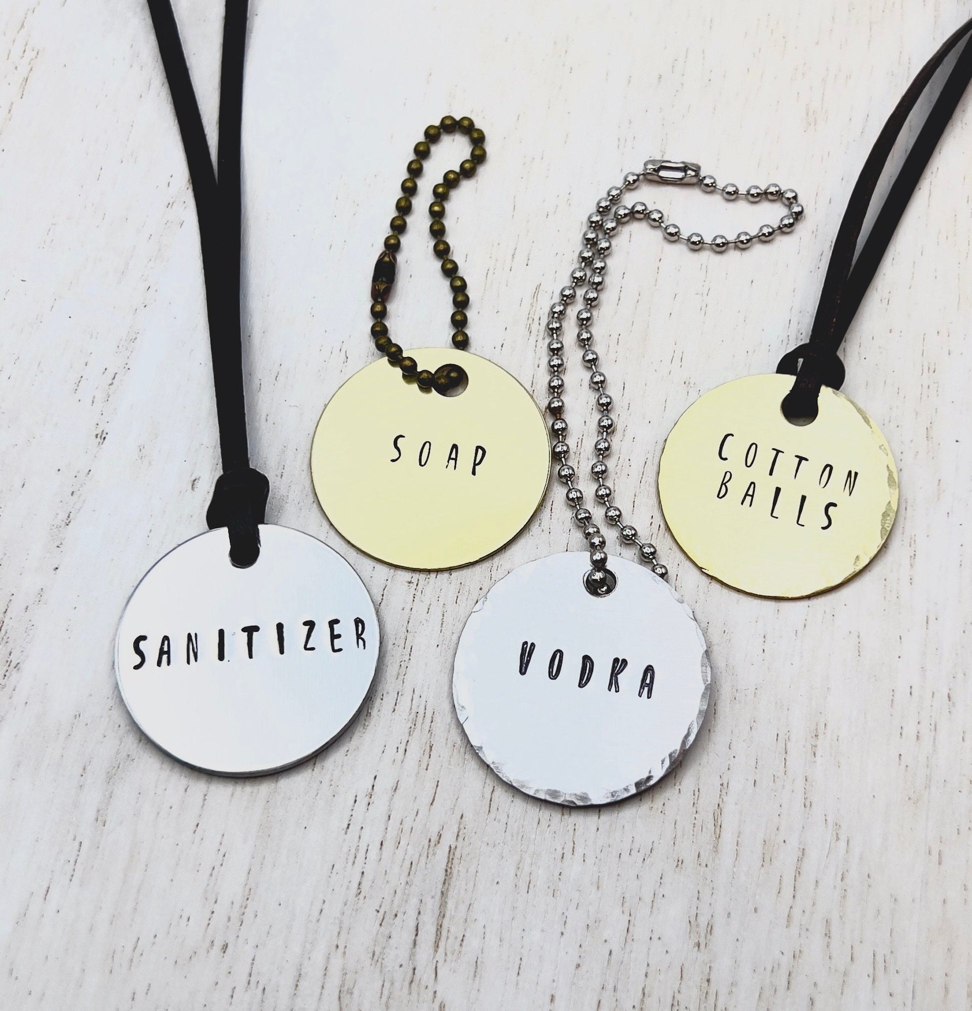 Keep organized with these cute hand stamped label tags. Choose from Silver aluminum or Brass. Comes with your choice of leather strap or stainless steel ball chain. Finished with smooth or hammered edges.