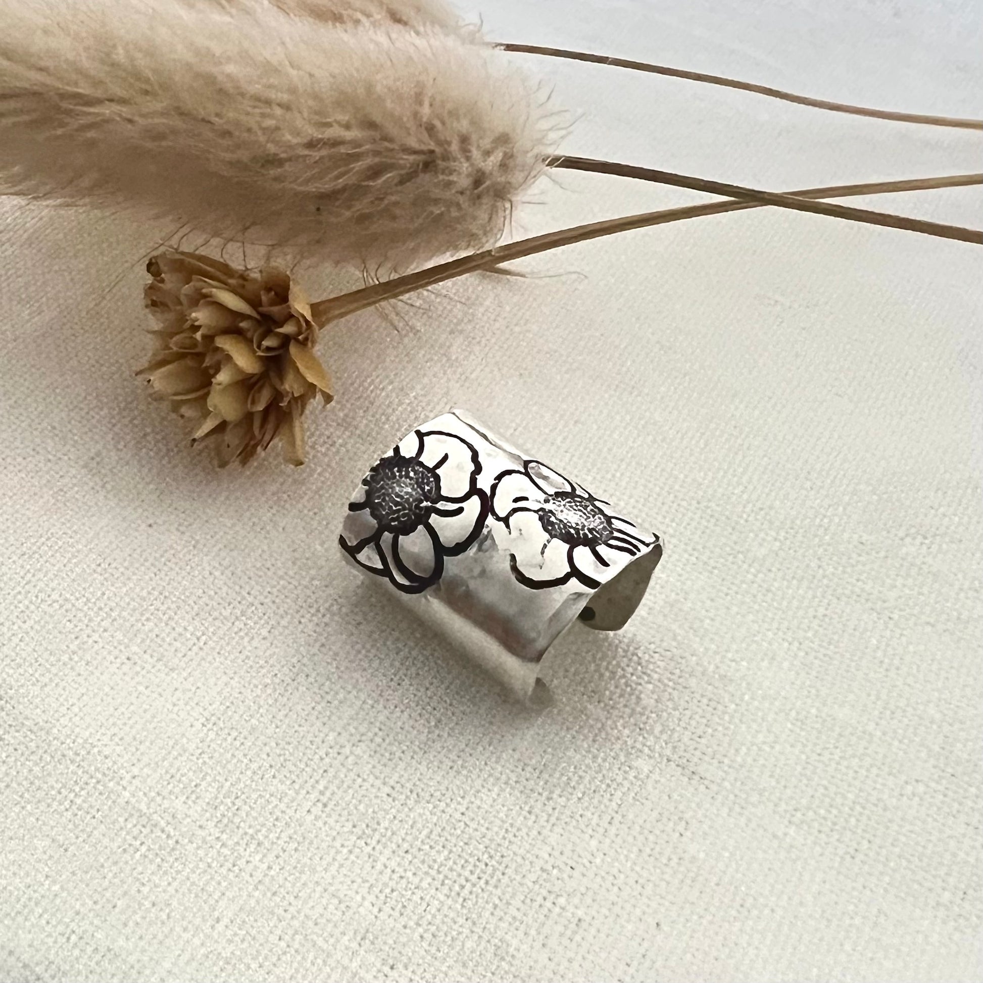 1/2" sterling silver ear cuff is hand formed and hammered out of .925 solid sterling silver, then hand stamped with a floral design. Ear cuff measures 12mm in diameter and 1/2" wide.