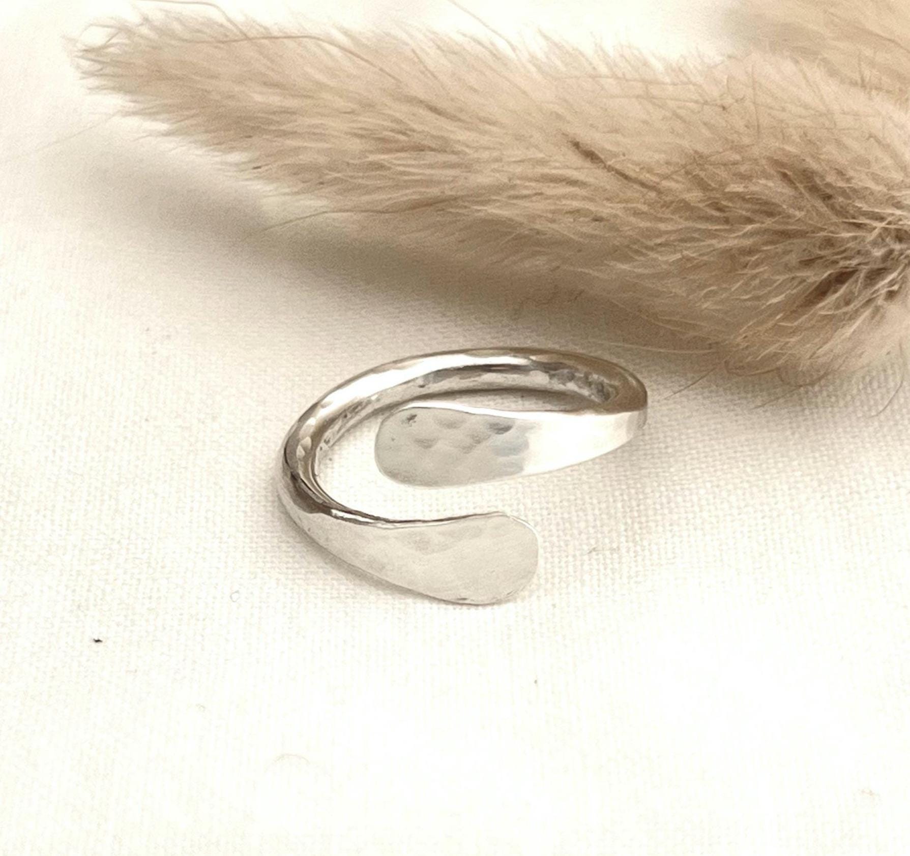 This sterling silver wrap ring is made of sterling silver that is hand forged and given a hammered finish.