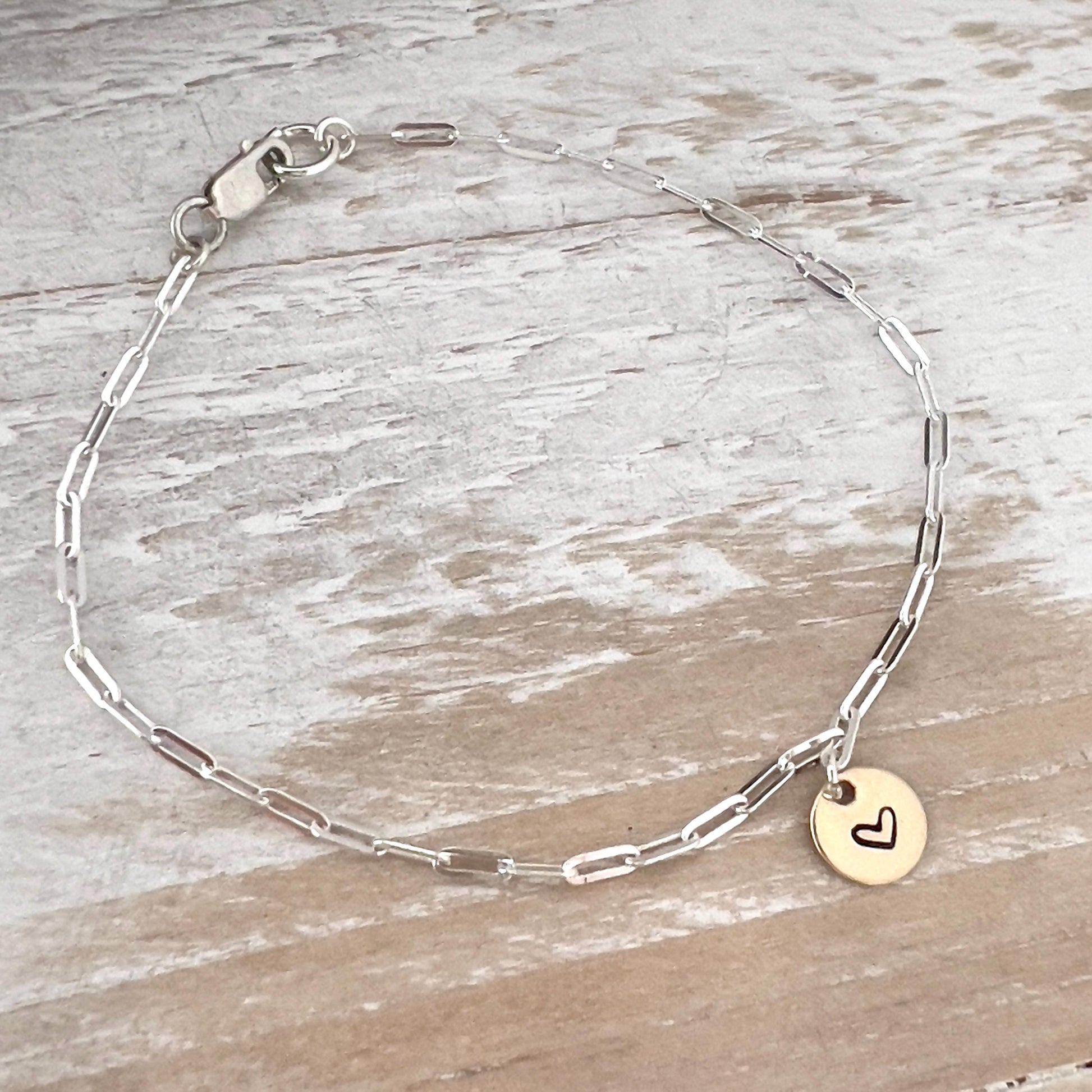 This sterling silver paperclip bracelet comes hand stamped with a 14k gold filled dainty intial charm or heart charm.