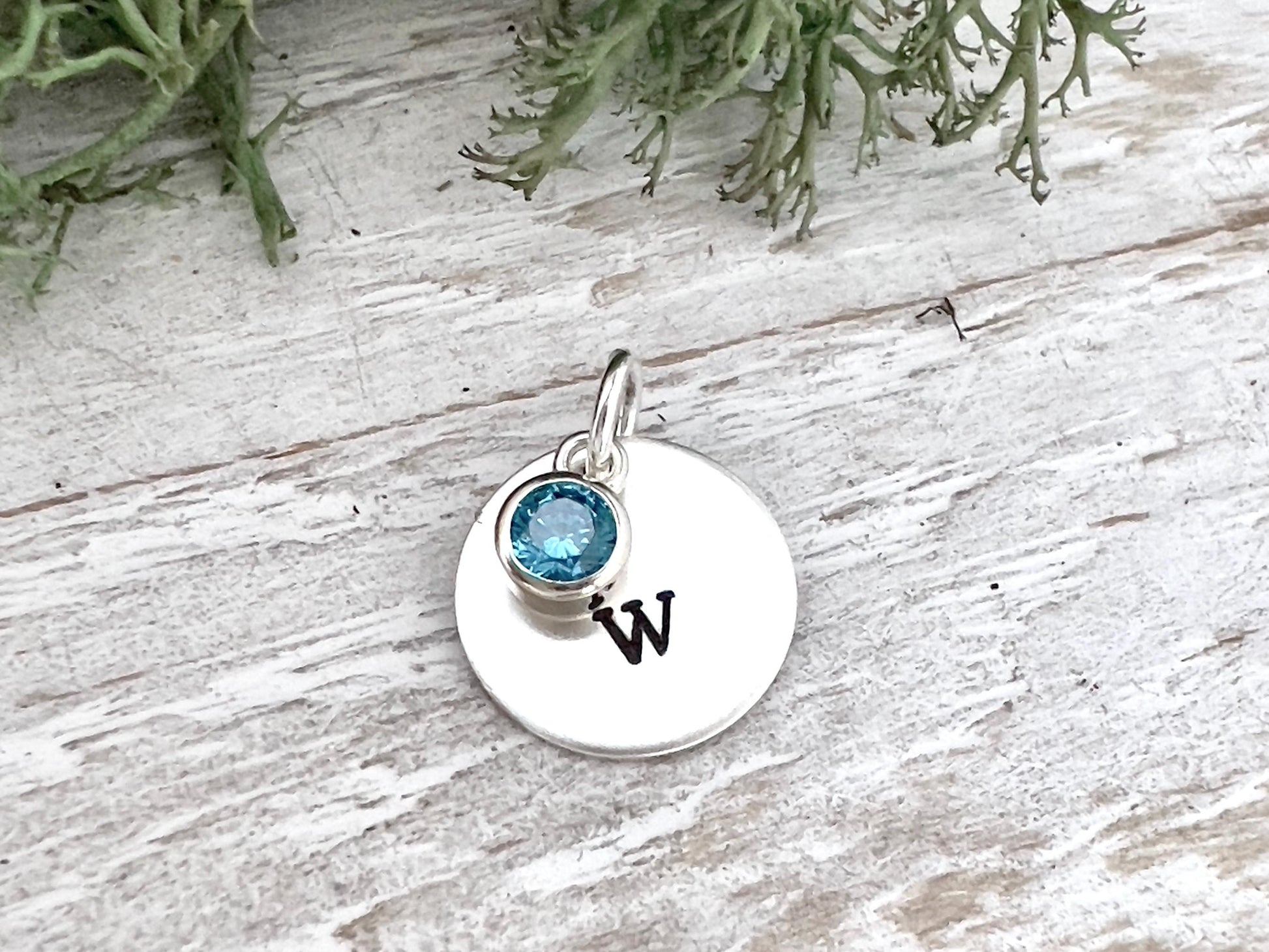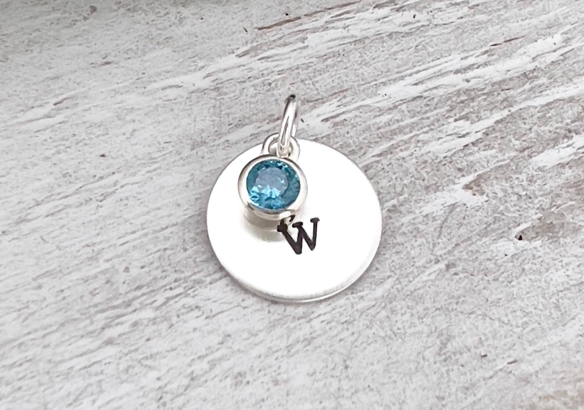 1/2" Sterling silver initial charm hand stamped with an initial of your choice, then embellished with a sterling silver birthstone. Sterling silver initial disc measures 1/2'