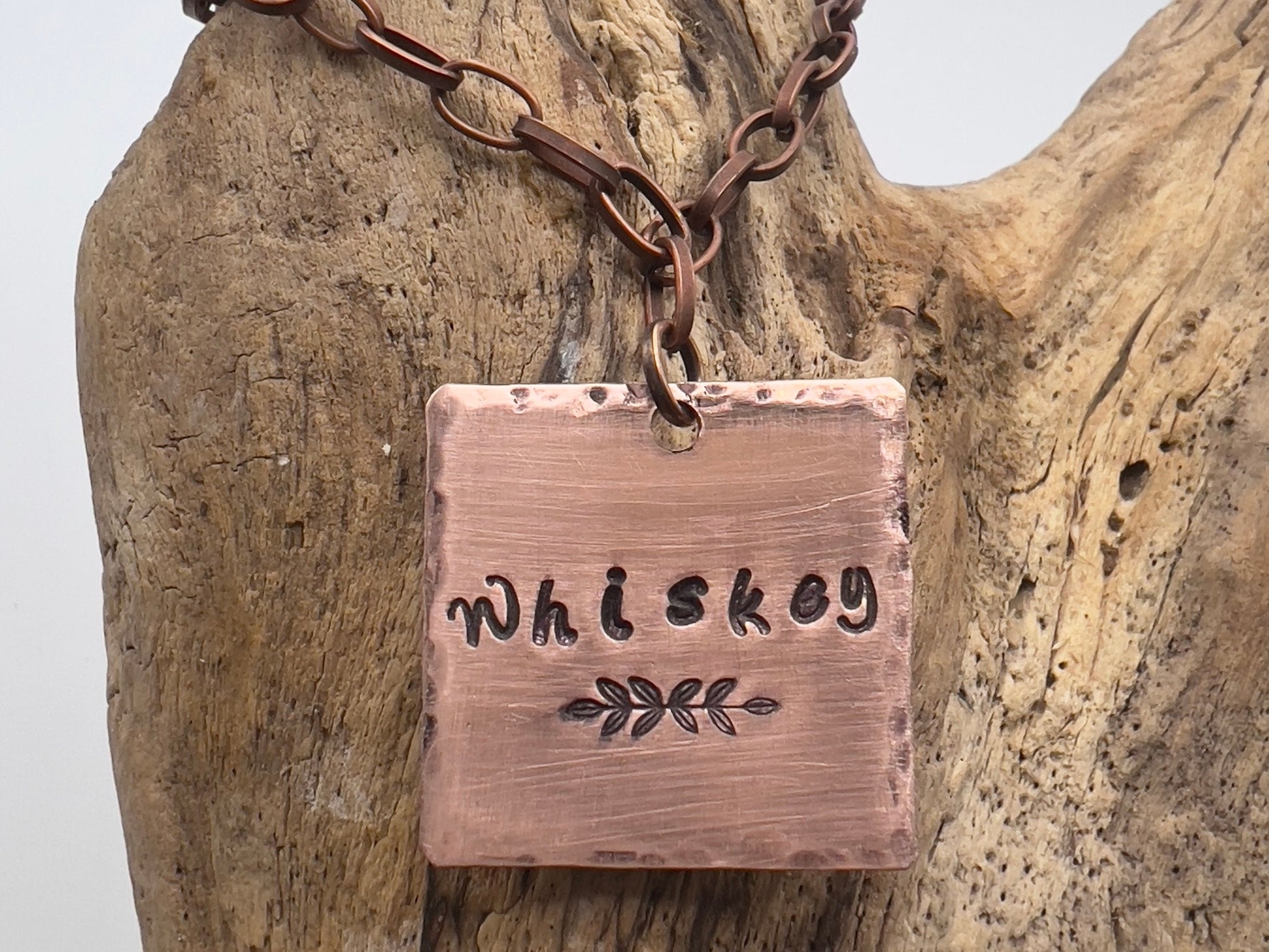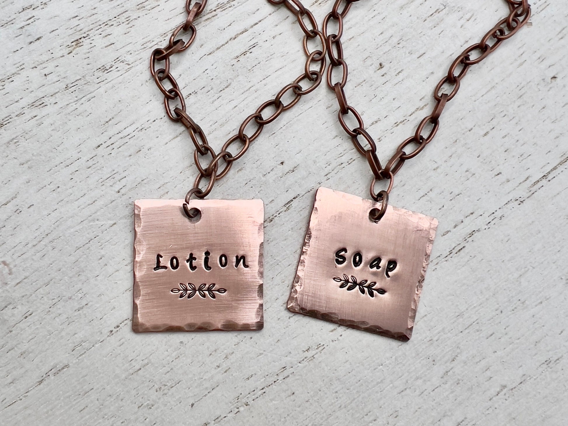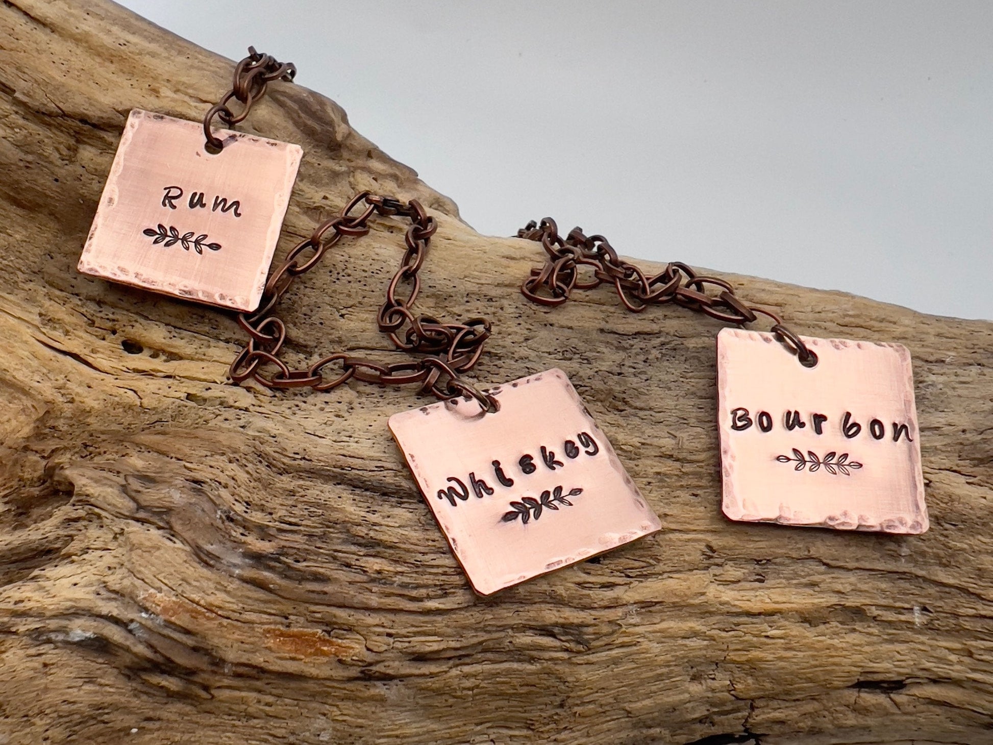 Keep organized with these cute hand stamped label tags. These tags can be used on any of your household bottles or decanters. Makes a great gift for a bottle of someones favorite beverage. Tags are solid copper hammered on the edges and hand stamped then hung from a copper chain.