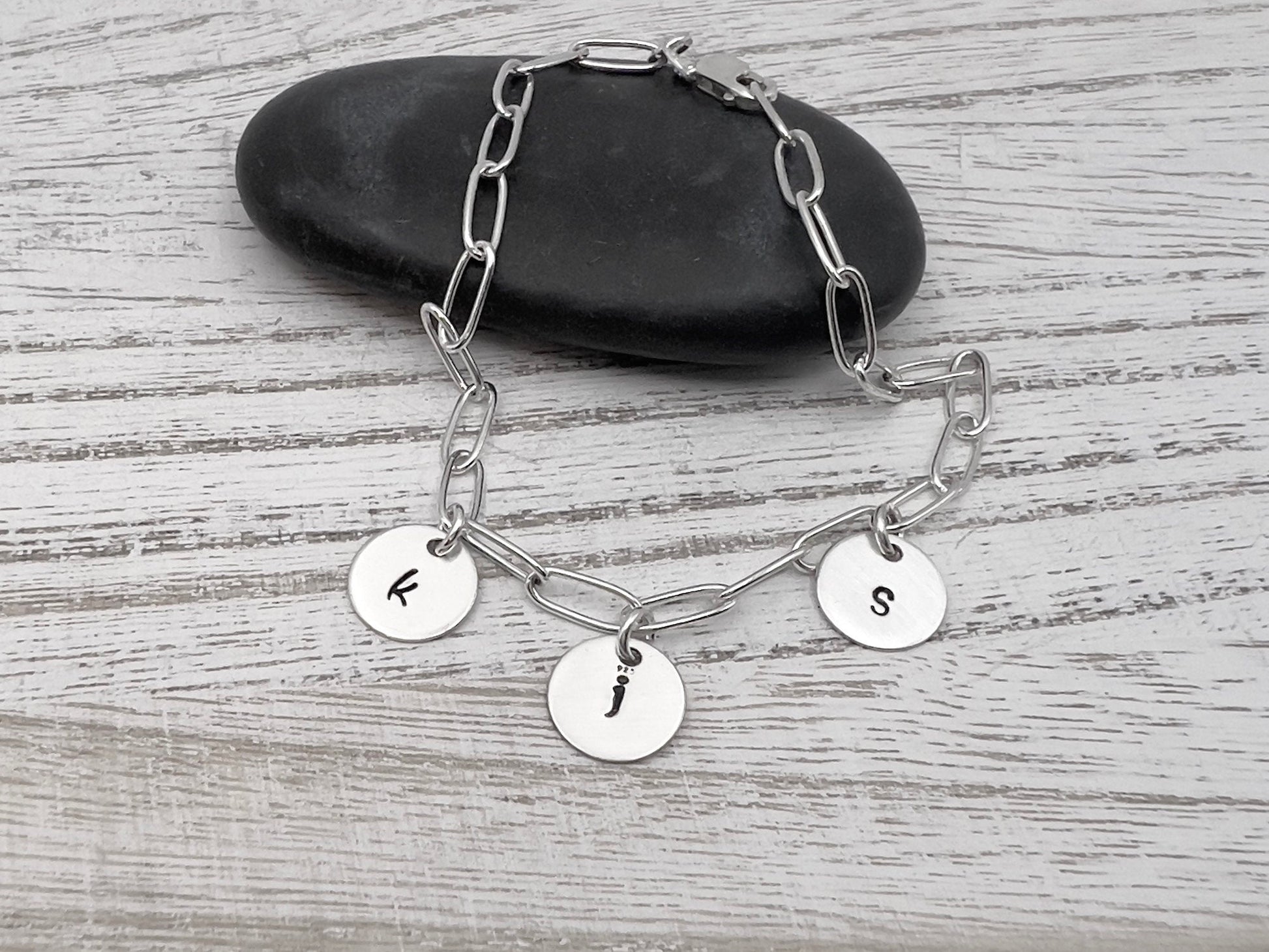 This sterling silver paperclip bracelet comes with your choice of hand stamped initial charms. Makes a great gift for mom with child's initials.
