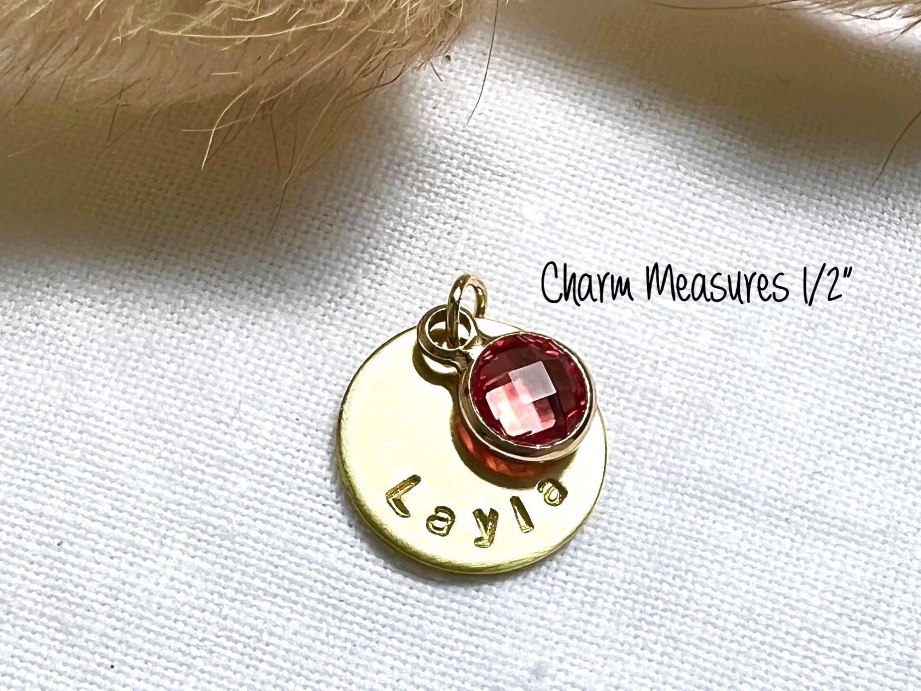Celebrate the ones you love with this beautifully handcrafted 14k gold filled disc charm, personalized with a custom name or word and paired with a sparkling birthstone charm. This dainty and timeless piece makes the perfect everyday accessory and a thoughtful gift for birthdays, anniversaries, Mother’s Day, or bridesmaids.