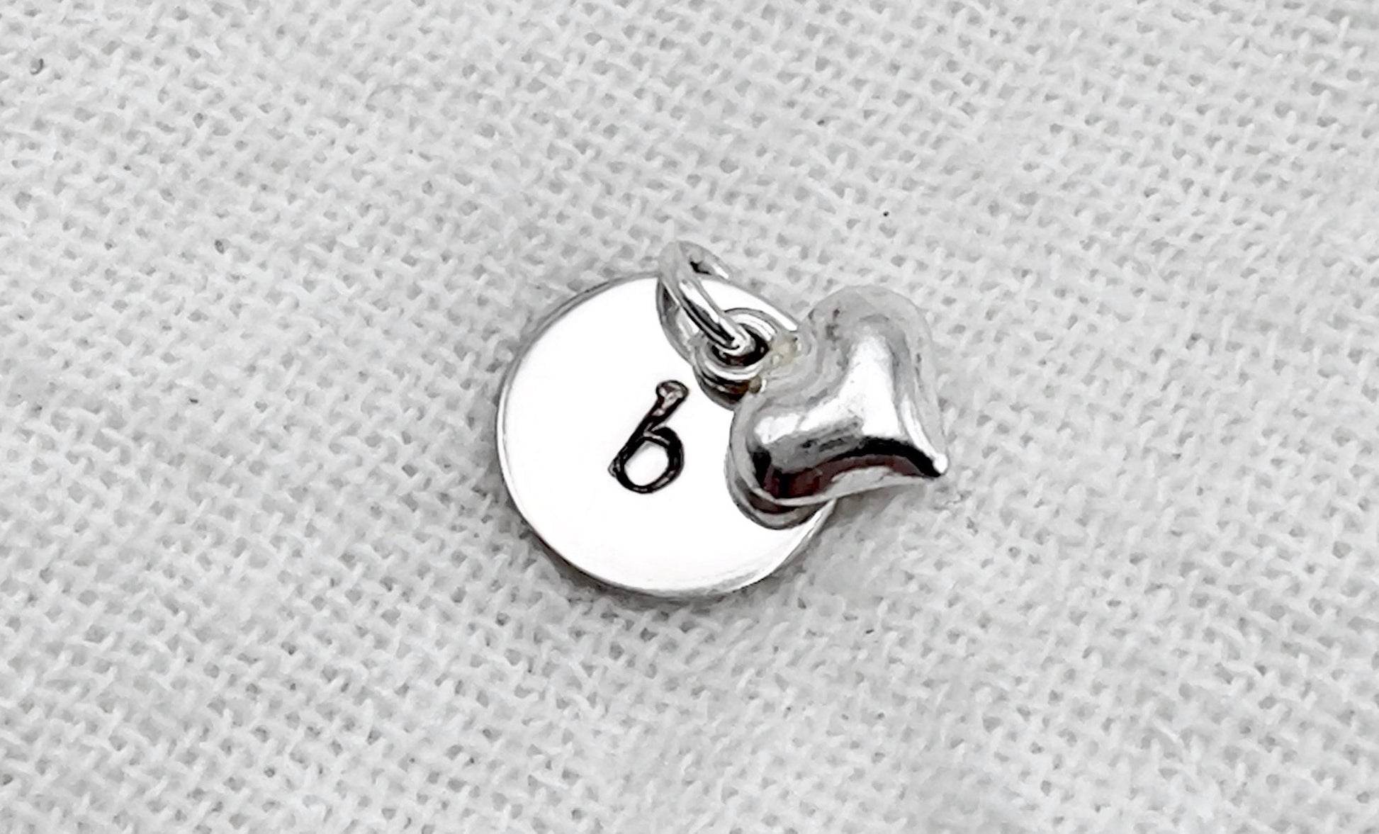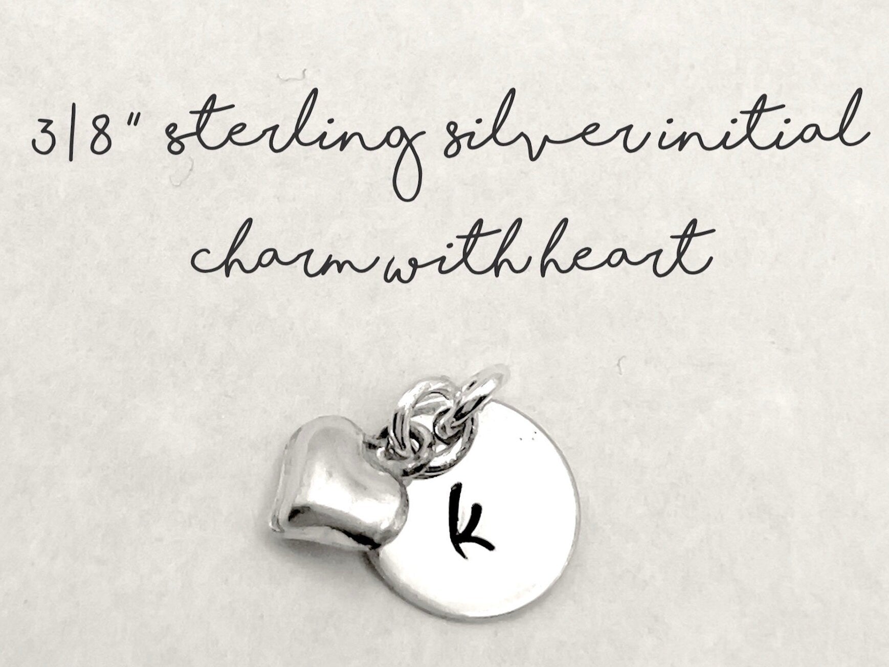 This dainty sterling silver initial charm with sterling silver heart comes hand stamped with a personalized initial charm of your choice.