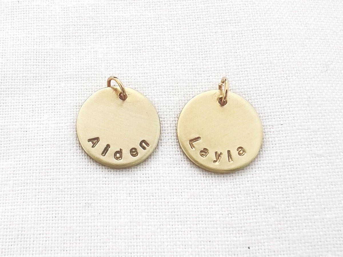 This 14k gold filled disc charm is created and finished by hand. Hand stamped with a name, or date in a tiny San Serif font. 14k gold filled disc measures 1/2" and comes with a 14k gold filled jump ring to attach to your favorite chain.