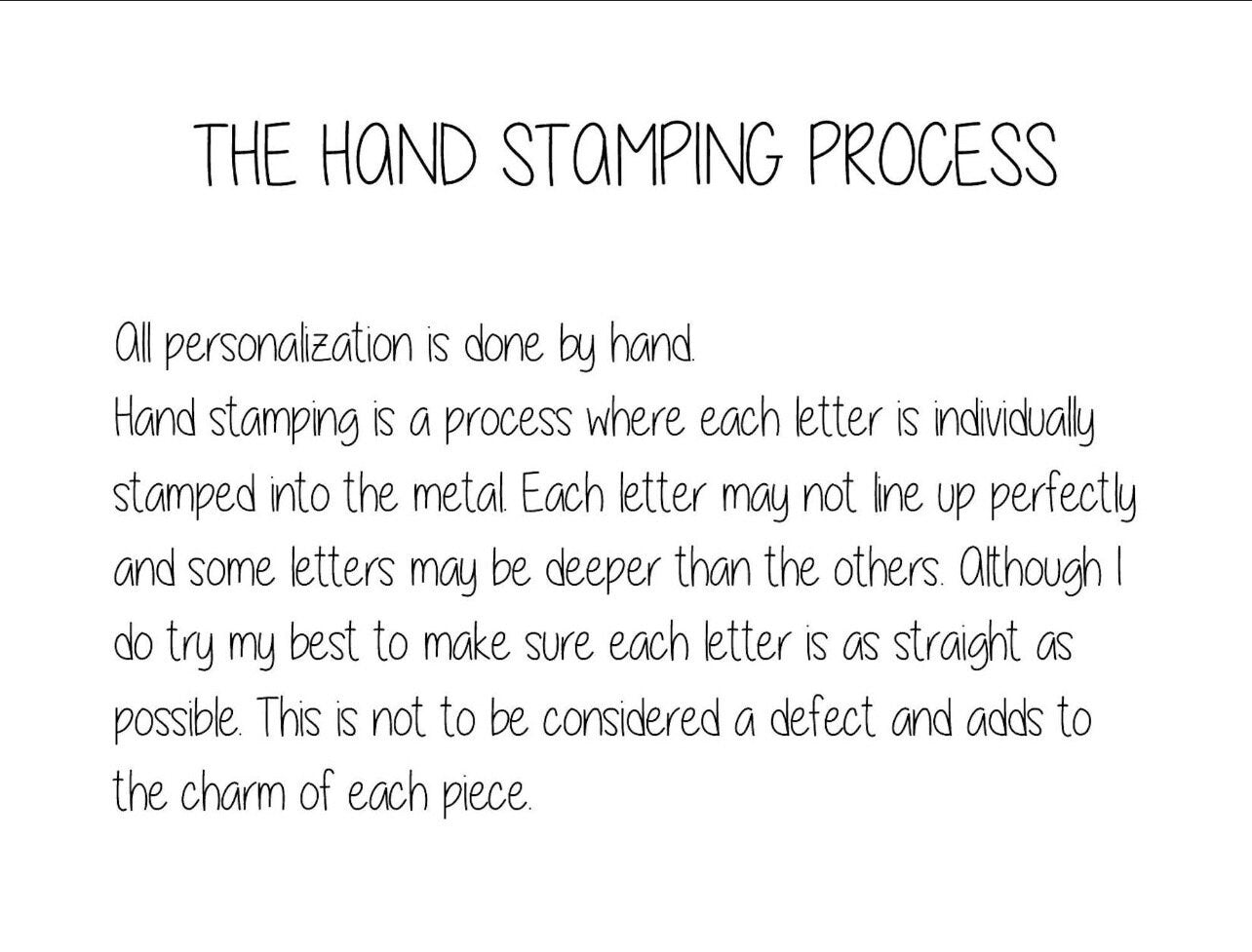 Hand stamping is a process where each letter is individually stamped into the metal. Each letter may not line up perfectly and some letters may be deeper than the others. Although I do try my best to make sure each letter is as straight as possible. This is not to be considered a defect and adds to the charm of each piece.