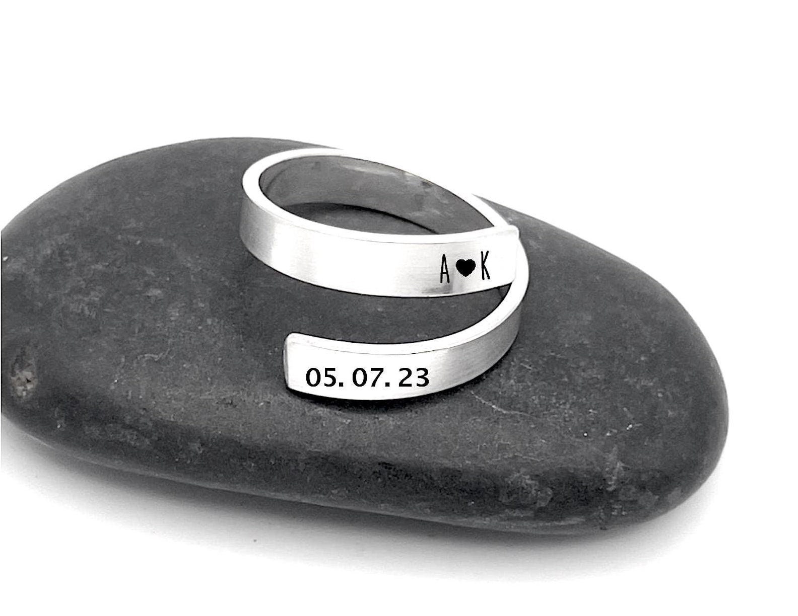 Sterling silver wrap ring hand stamped with a name, date, initials or word. Ring is hand forged out of solid sterling silver and has a slightly hammered finish. A heart can be added see design chart in pictures.