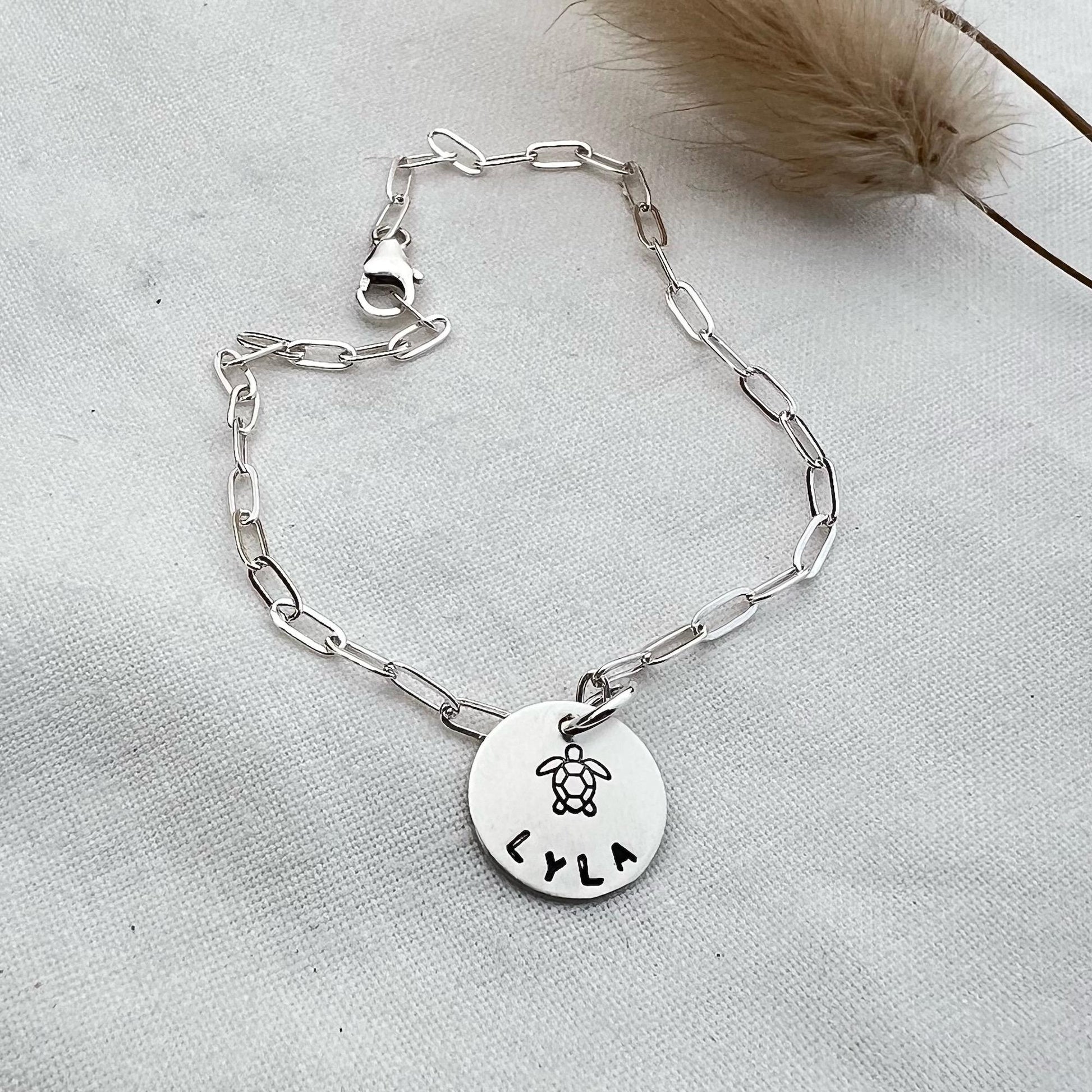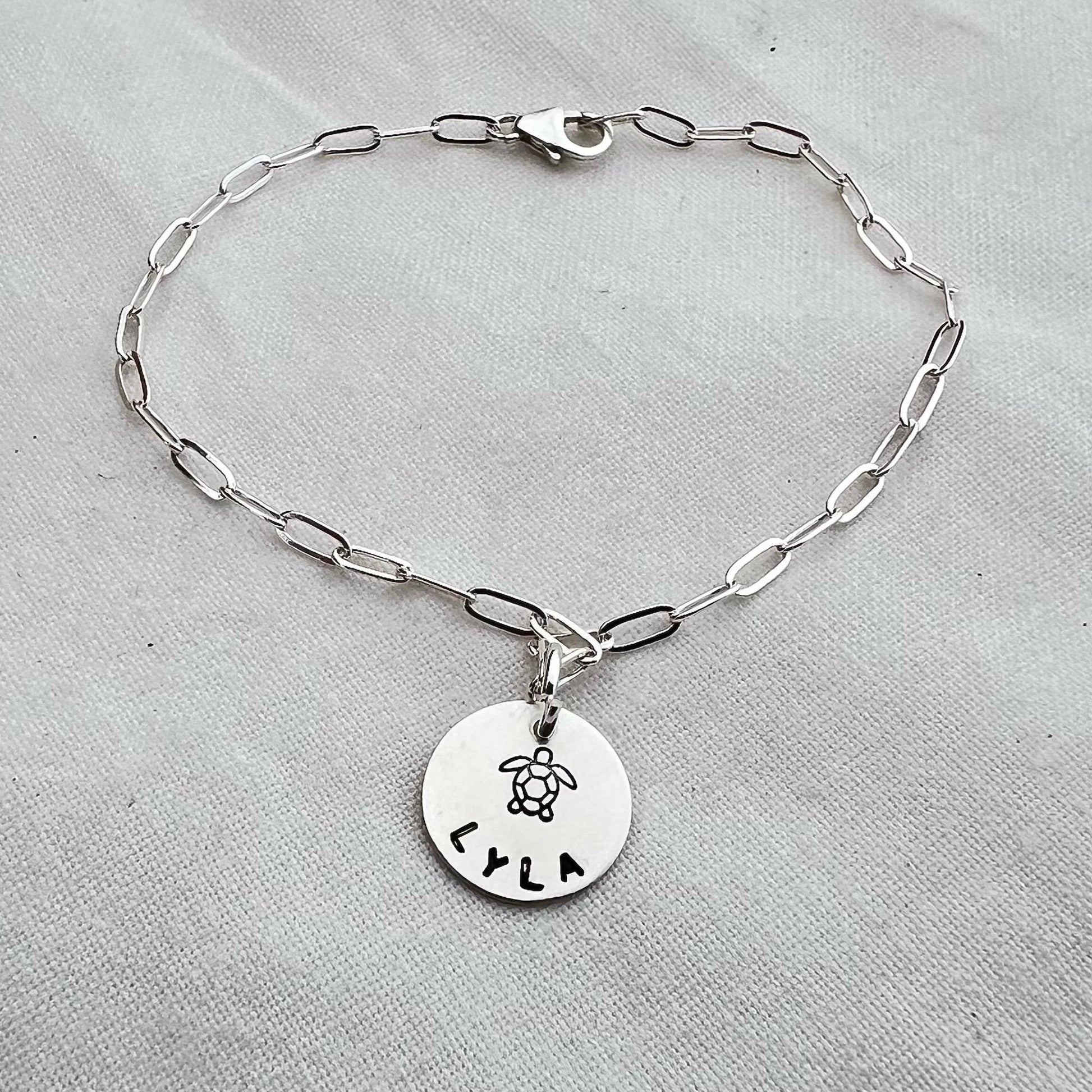 This sterling silver bracelet features a charming hand stamped turtle charm and a personalized name disc, making it a thoughtful and meaningful piece of jewelry. Whether you’re shopping for a beach lover, a sea turtle enthusiast, or a unique personalized gift, this bracelet combines beauty, sentiment, and ocean-inspired design.