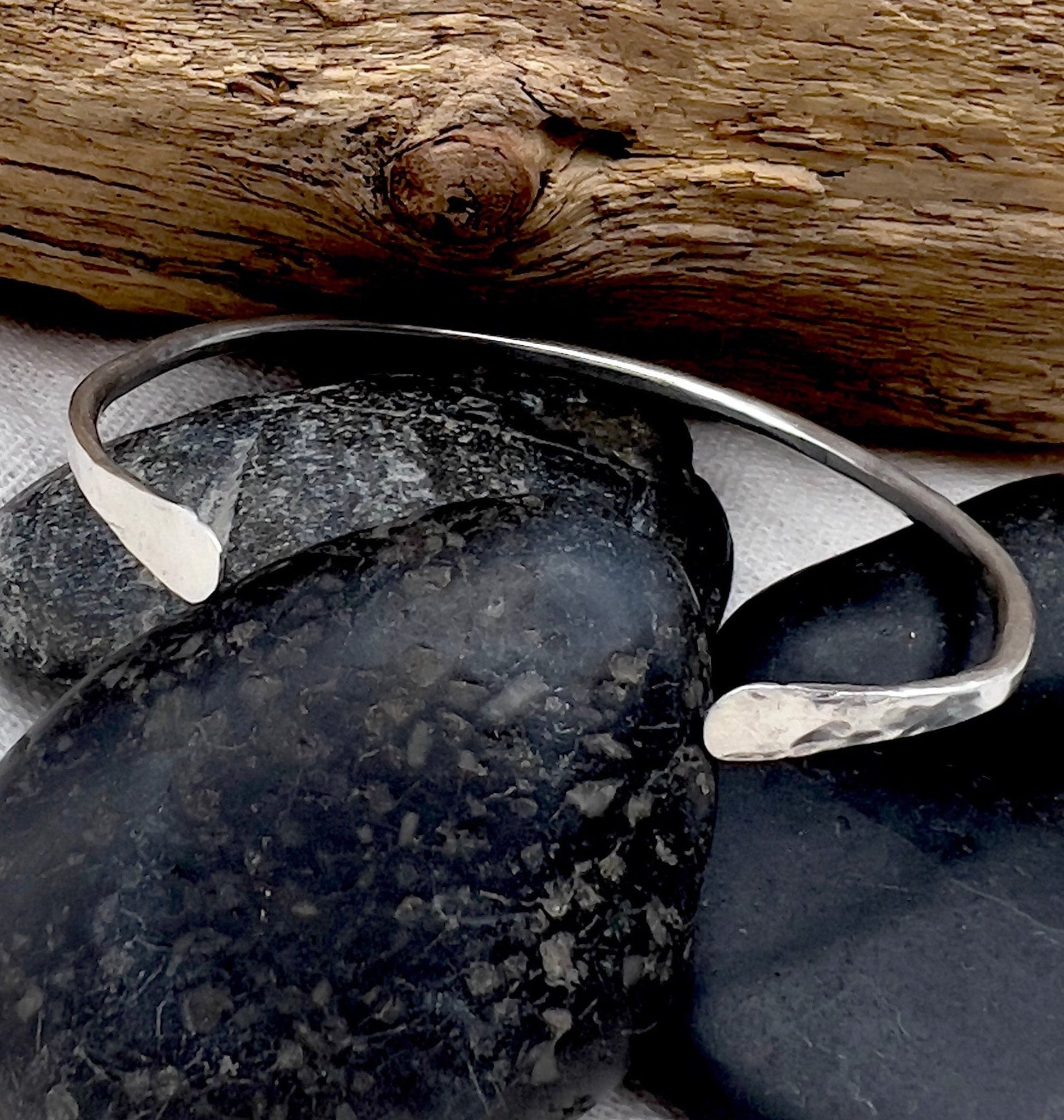 Solid .925 sterling silver hammered cuff bracelet made of heavy gauge sterling silver hand hammered and shaped into a simple cuff bangle. Great for everyday wear and stacking with other bracelets.